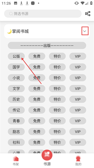 2、进入书源页面后,选择【掌阅书城】,并点击【公版】分类。