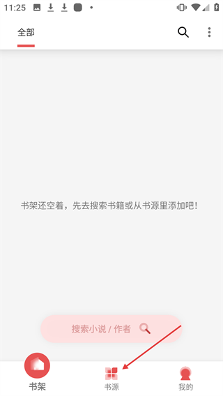 1、在小说阅读应用的书架页面,点击底部【书源】选项。