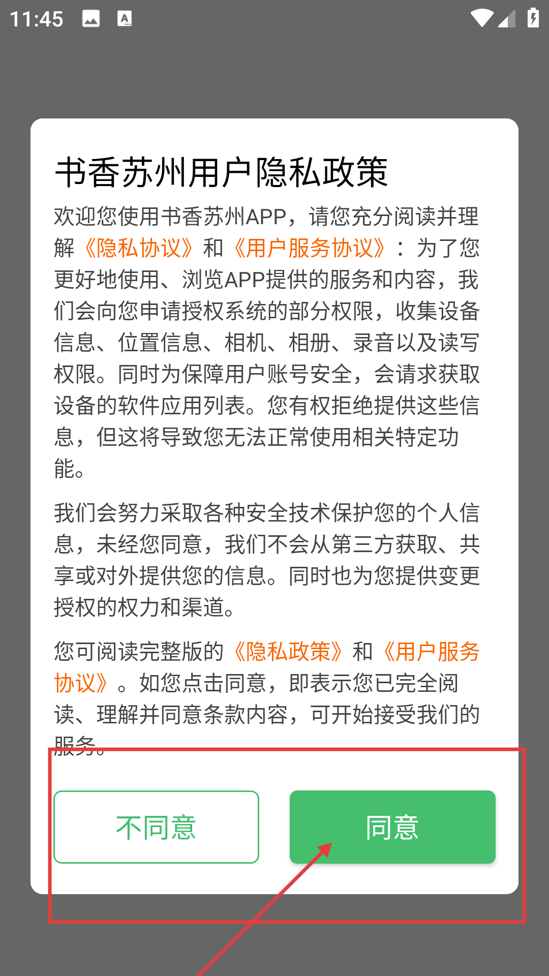 1、打开书香苏州APP后,仔细阅读后点击【同意】按钮,即可进入软件主界面。