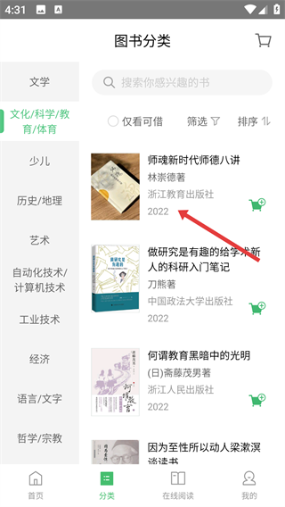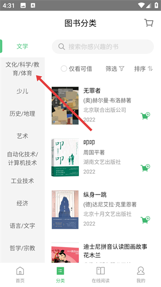 2、在图书分类界面,选择【文化/科学/教育/体育】类别,筛选教育类书籍哦。