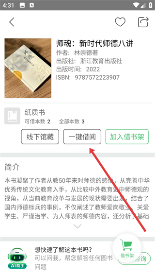 4、在书籍详情页,点击【一键借阅】,即可完成借书操作,很便捷啦。