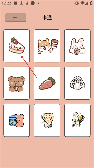 3、在【卡通】图案列表中,点击草莓蛋糕图案,可进入该图案的绘画编辑界面。