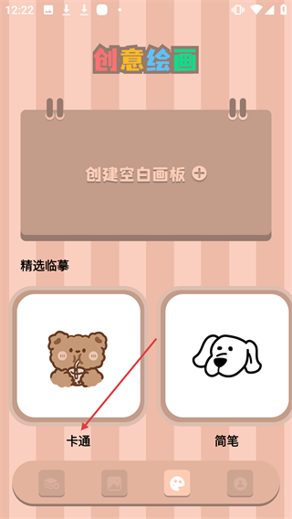2、进入【创意绘画】界面后,点击【卡通】选项,可进入卡通图案临摹列表。