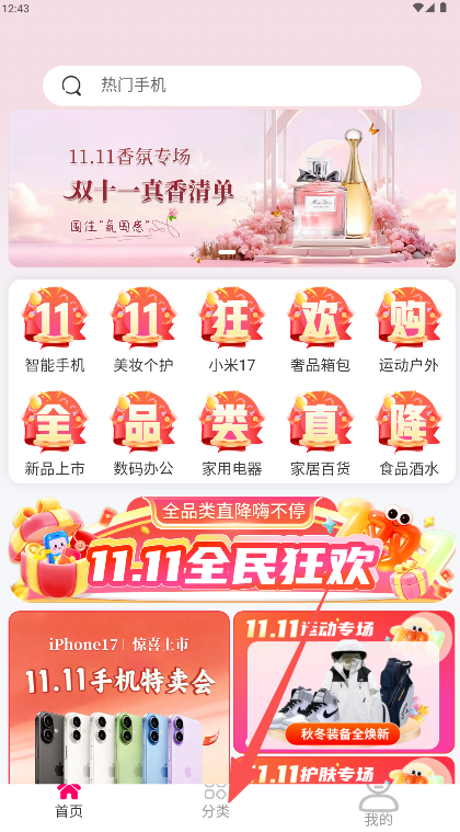 1、首页首屏直接展示11.11狂欢购等大型促销活动入口,营造强烈购物氛围和紧迫感。