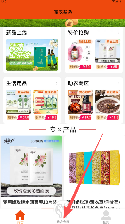 《富农鑫选》是一款聚焦农特产品与生活用品的电商软件,界面简洁明晰。内容分为新品上线、特价抢购、生活用品、助农专区四大板块,涵盖山茶油、日用品等多类商品,明确标注到手价,直观呈现优惠信息,该软件以助农为导向,整合产地优品与日常刚需,为消费者提供一站式选购平台。