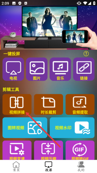 2、在投屏界面,点击【视频拼接】,进入视频选择界面。