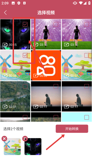 3、在视频选择界面【选择目标视频】后点击【开始转换】,进行视频拼接操作。