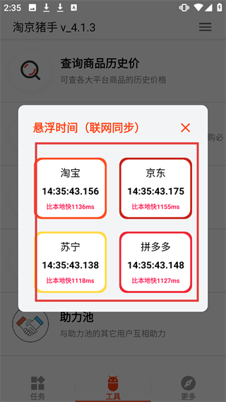 4、权限开启后,即可查看淘宝、京东、苏宁、拼多多等平台的网络时间差,便于蹲点抢购。