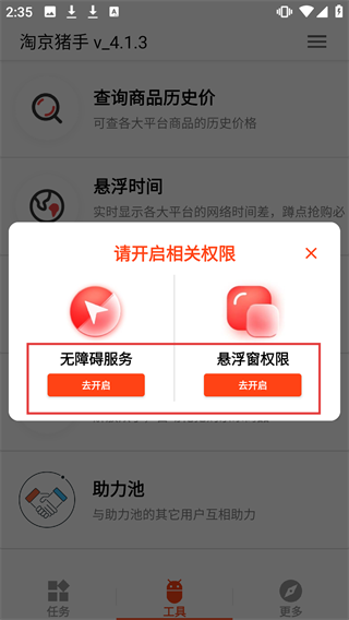3、在权限提示界面,分别点击【无障碍服务】和【悬浮窗权限】的【去开启】按钮,开启相关权限。