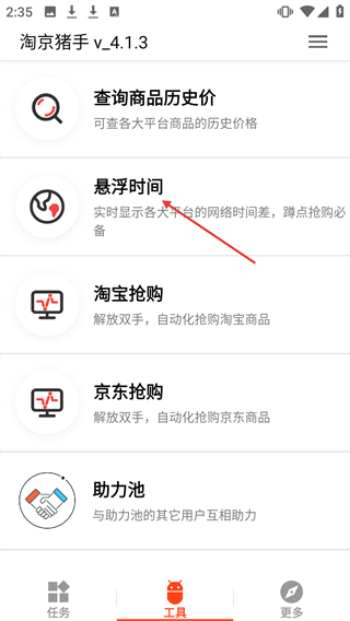 2、在工具界面,点击【悬浮时间】选项,进入权限开启提示界面。