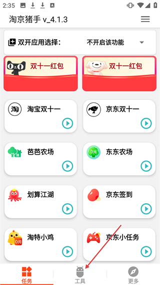 1、在淘京猪手应用的任务界面,点击底部【工具】选项,进入工具板块。