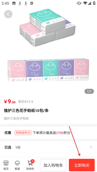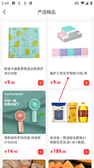 2、在严选商品列表页点击【植护三色花手帕纸10包/条】,进入该商品详情页。