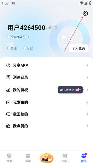 2、进入【我的】页面后,点击右上角【设置】图标,可进入设置界面进行相关操作。