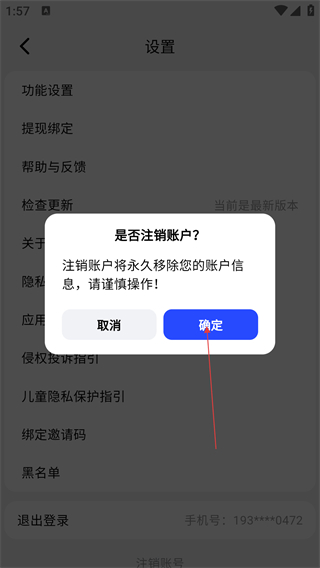 4、点击【注销账号】后,会弹出是否注销账户的提示框,点击【确定】即可完成账号注销操作。