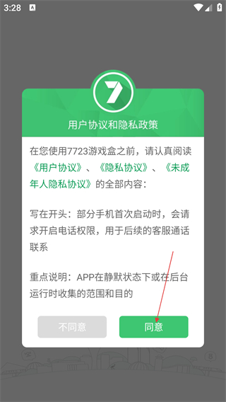 1、打开app,阅读【用户协议和隐私政策】后点击【同意】,即可进入应用。