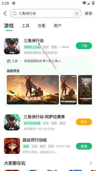 3、在搜索结果页,找到目标应用如【三角洲行动】,点击进入详情页。