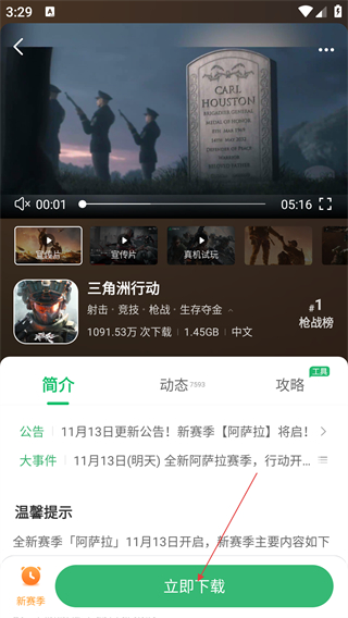 4、在应用详情页,可查看简介、动态等信息,点击【立即下载】即可开始下载应用。