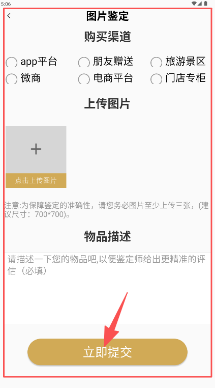 3、上传至少三张清晰物品图片并填写描述信息,最后点击“立即提交”完成鉴定申请。
