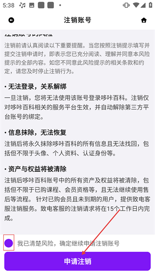 4、在注销账号说明页勾选确认后,点击【申请注销】,完成账号注销操作。