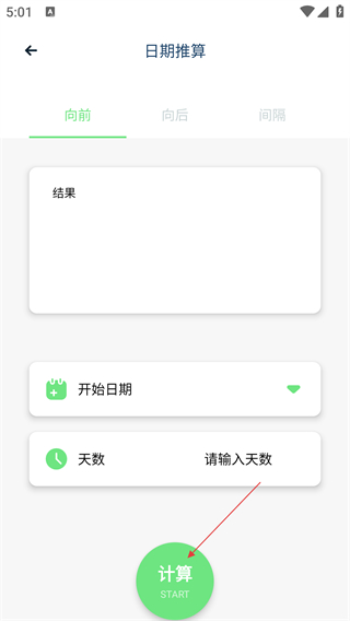3、在日期推算页面,选择推算方向(如向前),设置开始日期和天数后,点击【计算】按钮。