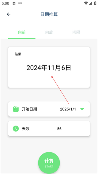 4、在结果区域可查看推算后的日期,如输入开始日期2025/1/1、天数56,可得到2024年11月6日的结果。