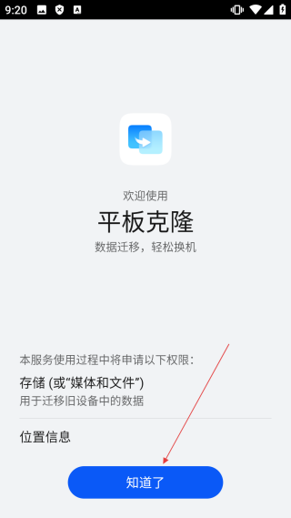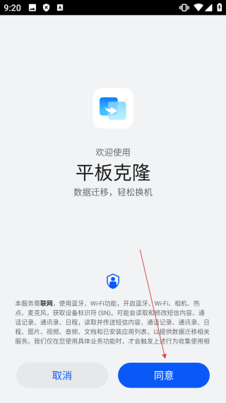 1、在平板克隆启动界面,点击【同意】,进入权限提示界面。