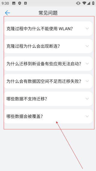 2、进入常见问题界面,可查看【克隆过程中WLAN使用、断连等问题解答,解决数据迁移疑惑】。