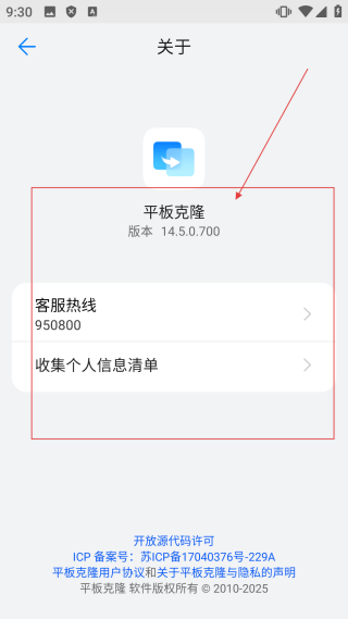 3、进入关于界面,可查看【平板克隆版本信息,获取客服热线,查看收集个人信息清单】,了解应用相关信息。