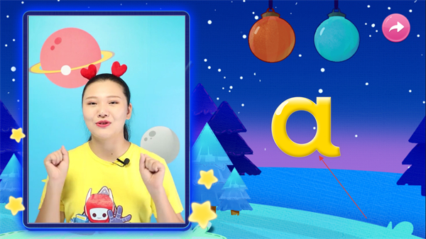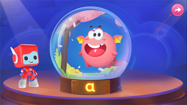 2、在拼音展示场景中,可查看【a】的趣味动画展示,点击右上角箭头可切换内容。