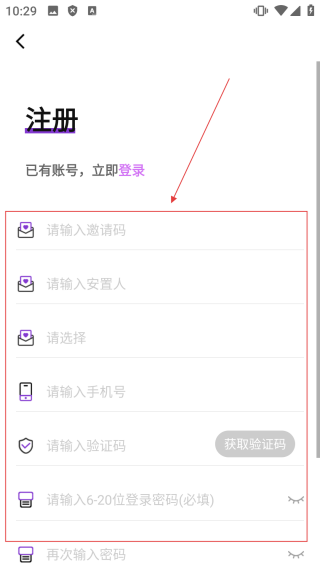 3、在注册界面,填写【邀请码、安置人、手机号、密码】等信息。