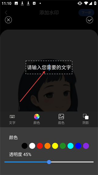 4、在文字输入框中输入需要的文字,可调整颜色、透明度等参数,完成后确认设置。