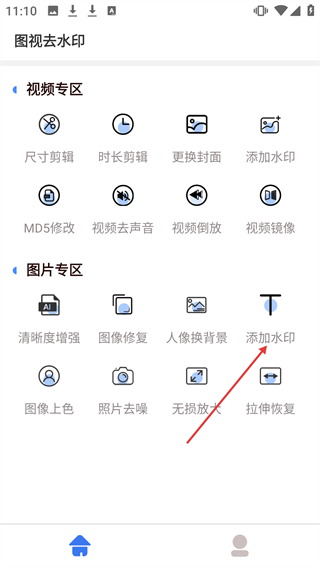 1、在图视去水印应用功能页,找到【图片专区】的【添加水印】功能,点击进入添加流程。