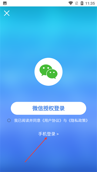 3、在登录方式选择界面,点击“手机登录”,进入手机号验证码登录界面。