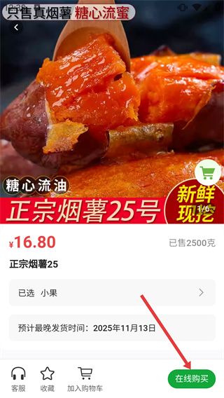 2、在供销好物页面选择【正宗烟薯25】,进入该商品详情页面。