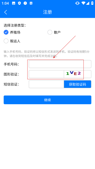 2、在注册界面选择注册类型后,填写【手机号码和图形验证信息】。