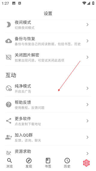 3、在设置界面,可找到【纯净模式】选项,点击可进入纯净模式设置界面。