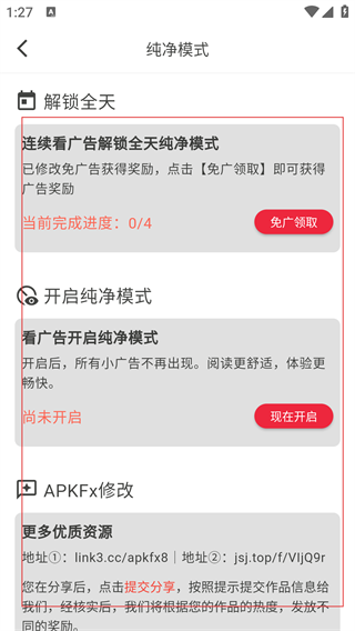 4、在纯净模式界面,可通过看广告或完成任务开启纯净模式,开启后可享受无广告的阅读体验。