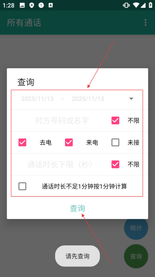 3、进入查询界面,可【选择时间、对方号码、通话类型等条件】,点击【查询】,获取符合条件的通话记录。