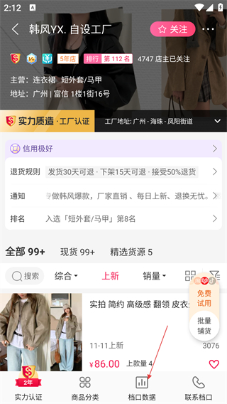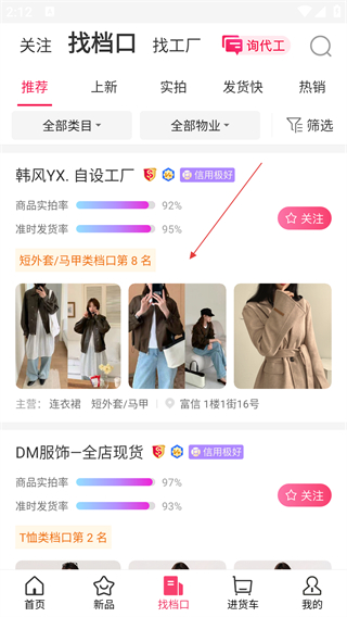 2、在找档口页面中,选择感兴趣的档口,如【韩YXX.自设工厂】,进入其详情页面。