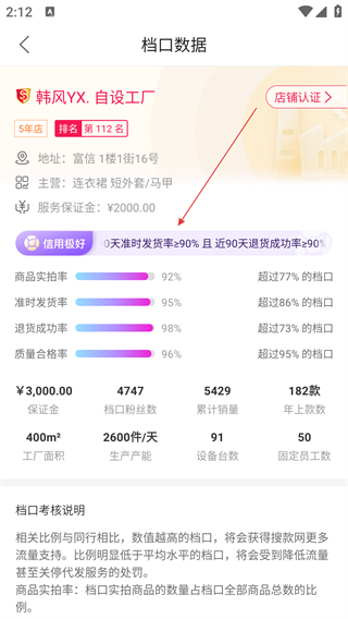 4、在档口数据页面中,可查看该档口的信用情况、商品实拍率、准时发货率等详细数据。