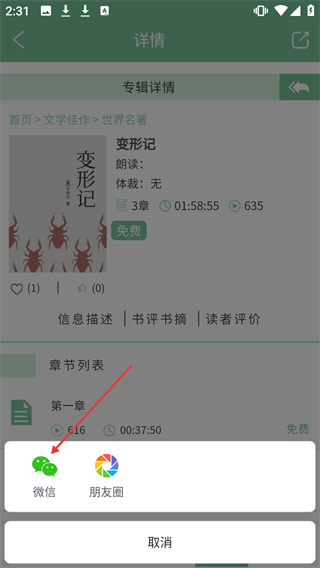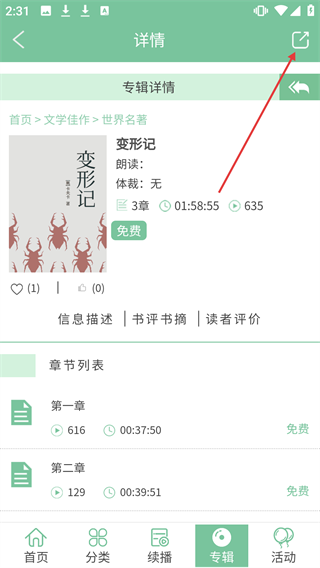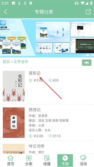 2、在【文学佳作】专题分类中,点击【变形记】可进入其详情页面。