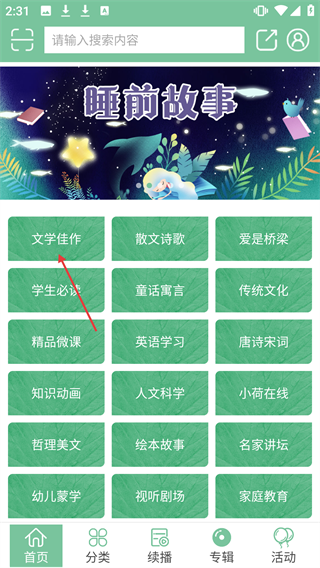 1、在该应用首页分类中,点击【文学佳作】可进入相关专题分类页面。