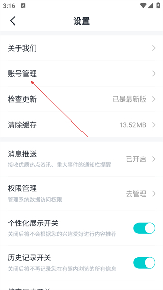 3、在设置页面,点击【账号管理】选项,进入账号管理页面。