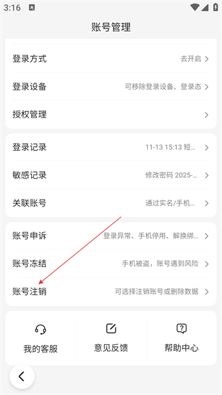 4、在账号管理页面,点击【账号注销】选项,可进行账号注销操作。