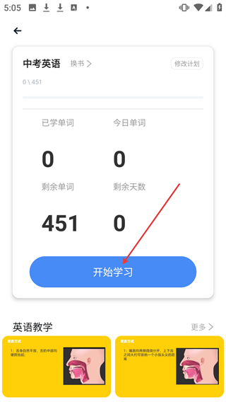 3、在中考英语单词计划页面点击【开始学习】,开启单词学习进程。