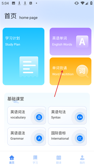 2、在首页点击【单词背诵】模块,进入单词学习入口。