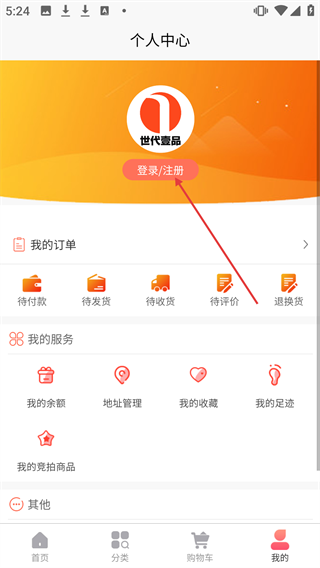 2、在个人中心页面,点击【登录/注册】按钮,可进入登录界面。