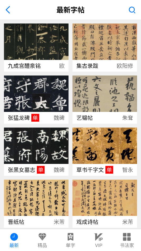 2、进入后,可自动搜索新的字帖,可选择一款进入详情学习阅读。