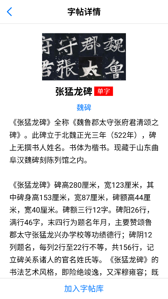 3、字帖里有字帖简介,若有喜欢的字帖,可点击下方的加入字帖库收藏。
