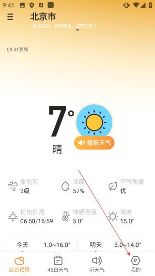 1、在天气界面,点击右下角【我的】,进入设置界面。
